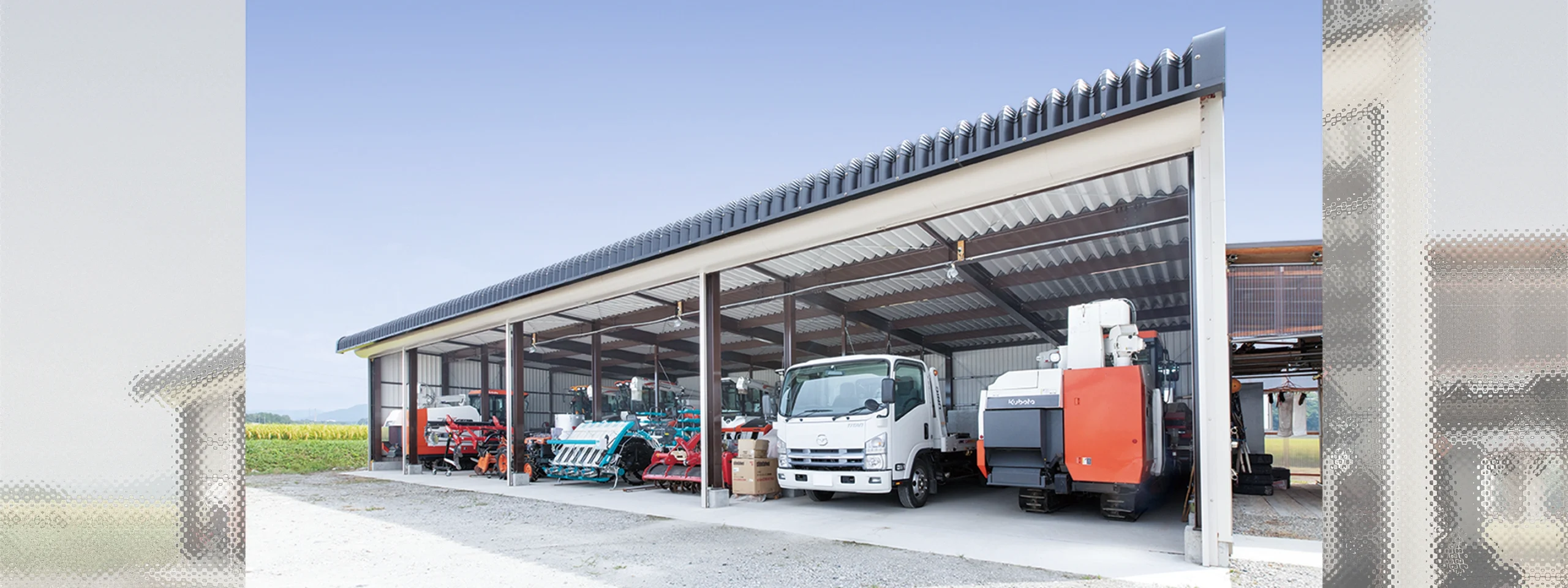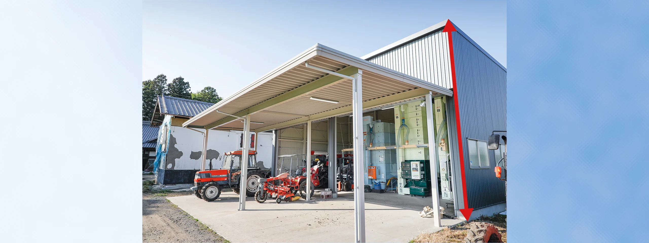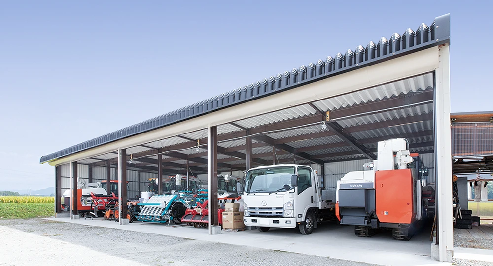 高さ6Mの大型倉庫、軒高50石の乾燥機や大型農工具もラクラク収納できます。