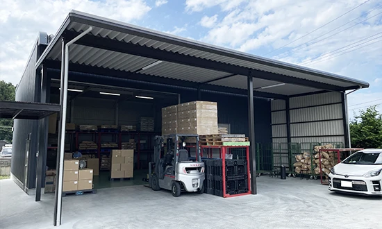 最大200㎡、高さ7mまで規格商品で対応できます。中柱なしの鉄骨造で作業効率が大幅に向上します。大型の建設資材や物流施設としてもご活用いただいております。
